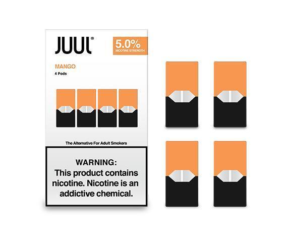 A package of two or four premium-quality JUUL salt e-liquid pods in an exotic mango flavor.